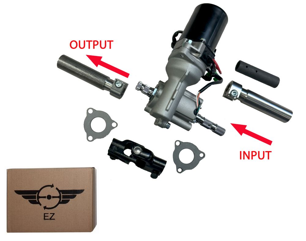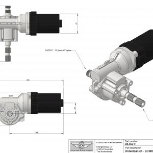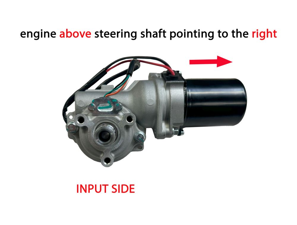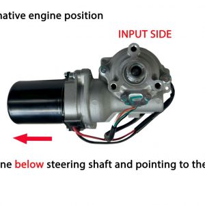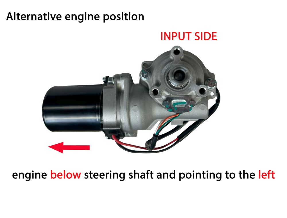 Universele Light Duty Elektrische stuurbekrachtiging kit. Motor wijzend boven de stuur as naar rechts kijkend vanaf de input kant (stuur kant). Als alternatief kan de motor ook onder de stuur as, wijzend naar links worden geplaatst. Houd echter wel rekening met de afmetingen (zie afbeelding 4).